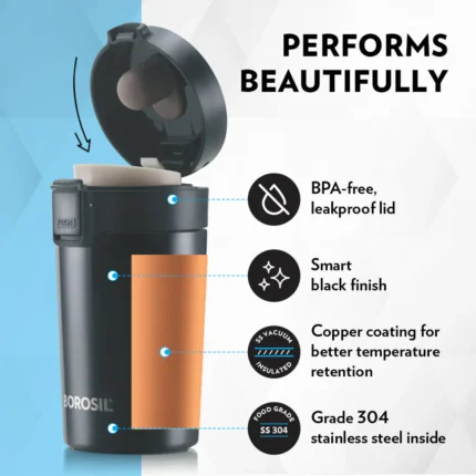 The Borosil Coffeemate Insulated Mug is a stylish and durable insulated mug designed to keep your beverages hot or cold for longer. Perfect for coffee, tea, or any drink on the go.