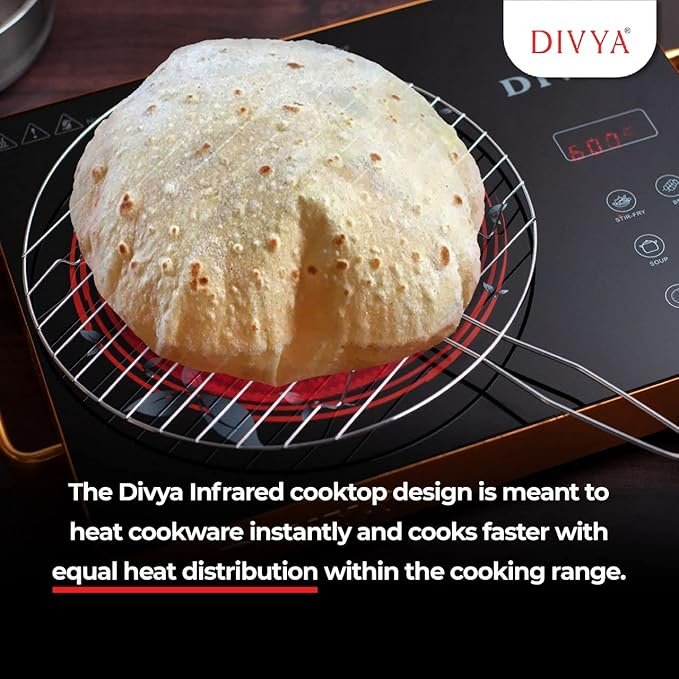 Transform your daily cooking with the powerful DIVYA DP-88 2000-Watt Infrared Cooktop. Designed for Indian kitchens, this advanced radiant cooktop delivers fast heating, uniform cooking, and complete control — all in a sleek, modern glass body.