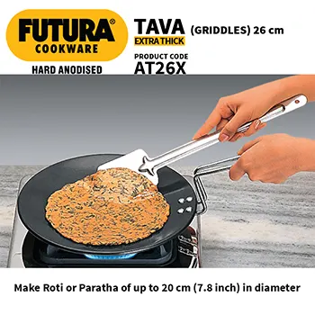 The Hard Anodised Tava 26 cm (AT26X) is a high-quality, heavy-duty cooking pan designed for preparing rotis, dosas, parathas, and pancakes with perfect results. Made from hard anodised aluminium with a thick 6.35 mm base, it ensures fast and even heat distribution for efficient cooking.