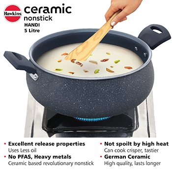 The Hawkins Induction Compatible Ceramic Nonstick Handi ICH50G is a large 5-litre cooking handi designed for healthy, efficient family cooking. Featuring premium German ceramic nonstick coating and induction compatibility, it allows you to cook delicious meals faster while using less oil.