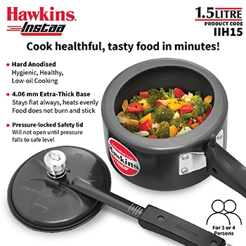 The Hawkins Instaa 1.5 Litre Pressure Cooker (IIH15) is designed for modern kitchens that require fast, safe, and energy-efficient cooking. With its hard anodised body inside and out, it offers superior durability, hygienic cooking, and long-lasting performance.