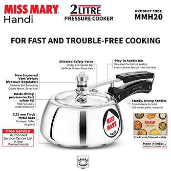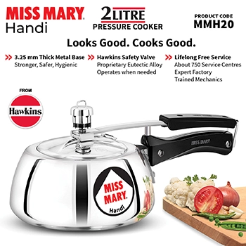 The Hawkins Miss Mary Handi 2 Litre (MMH20) pressure cooker is crafted for those who enjoy traditional handi-style cooking with modern safety features. The specially designed curved body allows easy stirring of dishes like dal, curries, and khichdi while giving better visibility of the food while cooking.