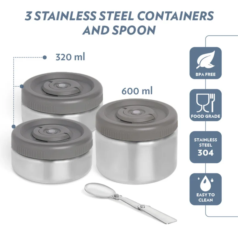 Material: Food-Grade Plastic with PU Insulation, Stainless Steel Containers with Lids